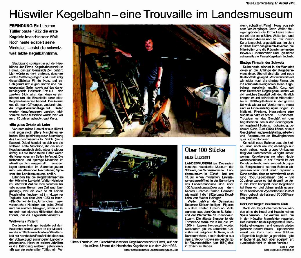 rum, wie Alexander Rechsteiner, Sprecher des Landesmuseums, erklärt. Erfunden hat die Kegelstellmaschine der Hüswiler Landwirt Walter Heiniger im Jahr 1930. Auf die Idee brachten ihn «die oberen Herren von Zell und Umgebung», weil sie «wie so oft keinen Kegelsteller fanden», ist im «Luzerner Tagblatt» aus dem Jahr 1983 zu lesen. «Die Gemeinderäte, Amtsrichter usw. versprachen Heiniger ein gutes Zvieri und ein rechtes Trinkgeld, wenn er irgendein technisches Hilfsmittel finden konnte, das die Kegelsteller ersetzt.»